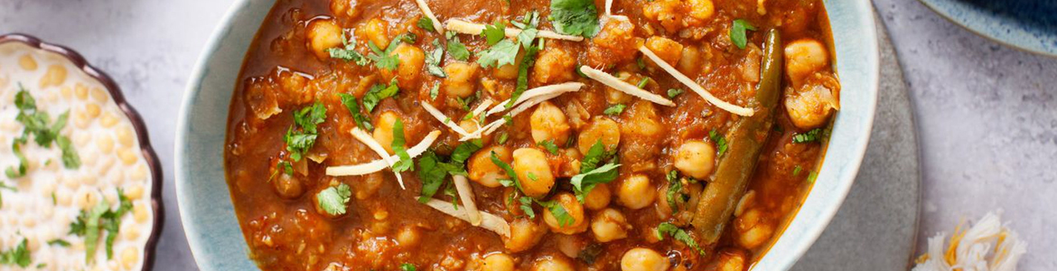 Chickpeas curry traditionally based with green chillies, onions, garlic, fresh cilantro and a blend of Indian spices