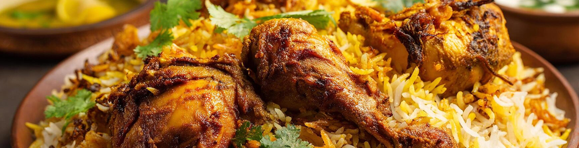A rice delicacy cooked in layers of chicken, basmati rice, saffron, butter, and Indian spices garnished with caramelized onions and served with raita